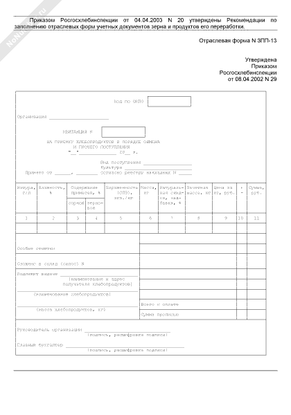 Квитанция на приемку хлебопродуктов в порядке обмена и прочего поступления. Отраслевая форма № ЗПП-13 (рекомендуемый образец заполнения)