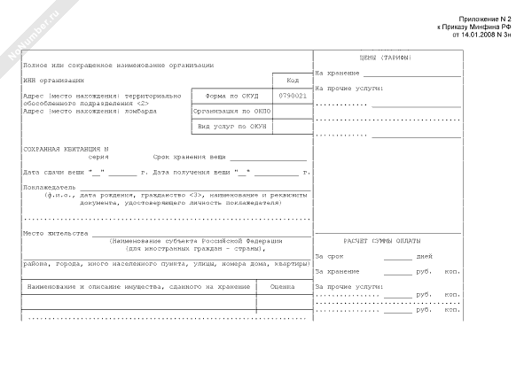 Сохранная квитанция, применяемая в случае оказания услуг ломбарда населению (рекомендуемый образец заполнения)