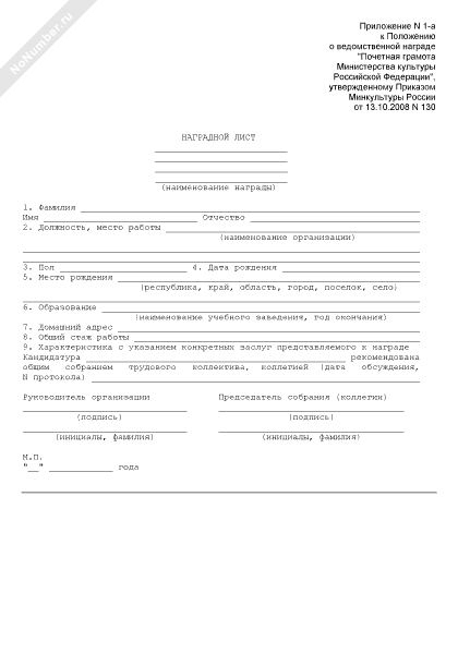 - 308Наградной лист — ходатайство о награждении Почетной грамотой Министерства культуры Российской Федерации