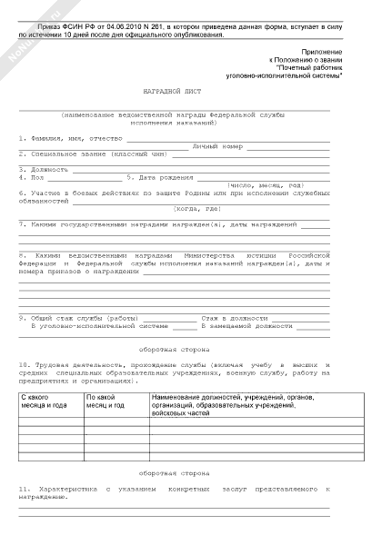- 316Наградной лист к званию «Почетный работник уголовно-исполнительной системы»