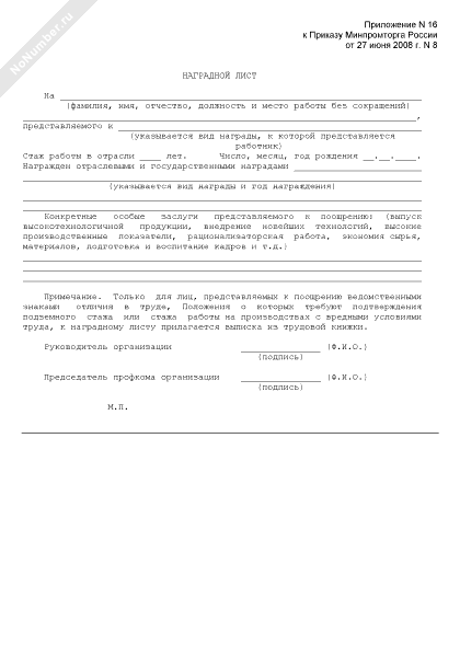 - 319Наградной лист, представляемого к поощрению ведомственными знаками отличия в труде, Министерства промышленности и торговли Российской Федерации