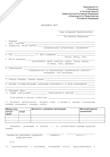 - 310Наградной лист для представления к награждению Почетной грамотой Правительства Российской Федерации и объявлению благодарности Правительства Российской Федерации за заслуги в содействии проведению социальной и экономической политики государства, осуществлению эффективной деятельности федеральных органов исполнительной власти, развитию местного самоуправления, обеспечению законности, прав и свобод граждан, укреплению обороноспособности страны и государственной безопасности, реализации внешней политики государства (для военнообязанных)