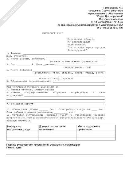 - 301Наградной лист гражданина, способствующего развитию города Долгопрудный и представленного к награждению Знаком отличия «За заслуги перед городом Долгопрудный» Московской области