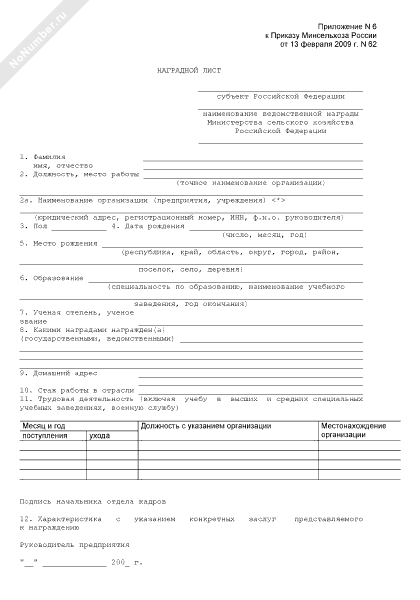 - 311Наградной лист министерства сельского хозяйства Российской Федерации