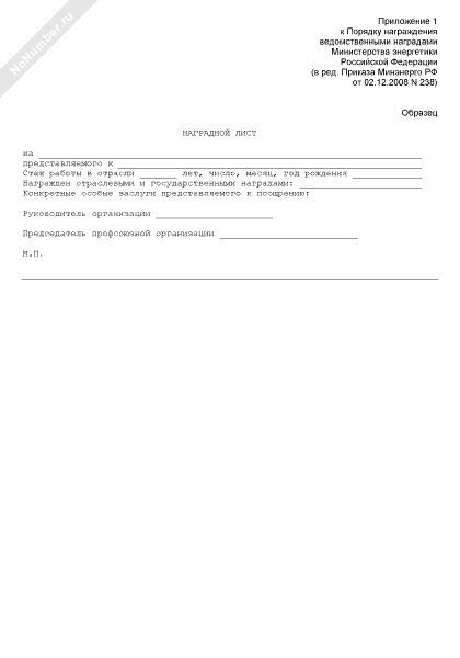 - 307Наградной лист на каждого кандидата к награждению ведомственными наградами Министерства энергетики Российской Федерации