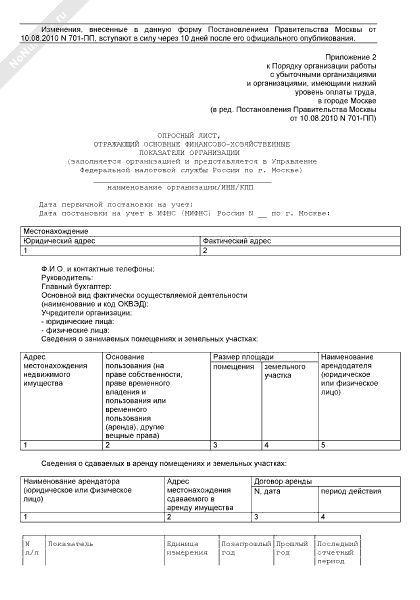 - 357Опросный лист, отражающий основные финансово-хозяйственные показатели организации в городе Москве