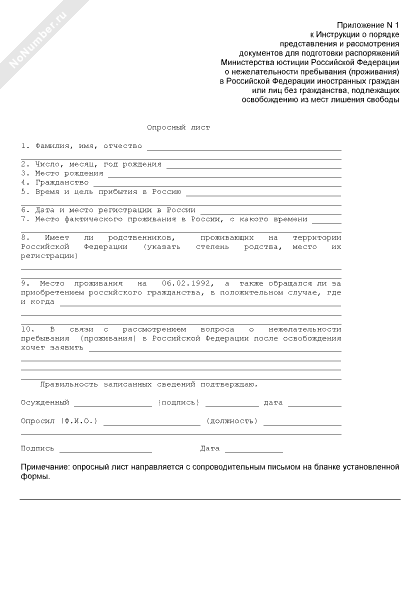 - 358Опросный лист, оформленный администрацией учреждения исполняющего наказание, в отношении иностранного гражданина, осужденного за совершение умышленного преступления