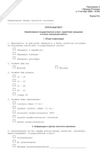 - 359Опросный лист. Наименование государственной услуги: содействие гражданам в поиске подходящей работы. Форма № 01Н