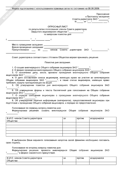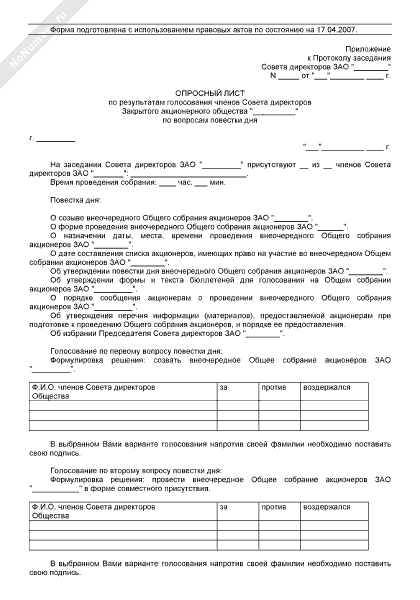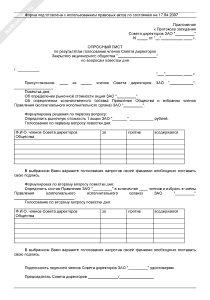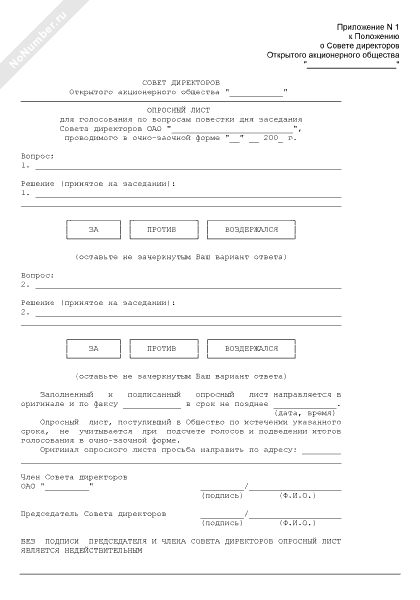 - 352Опросный лист по результатам голосования членов совета директоров закрытого акционерного общества по вопросам повестки дня (приложение к протоколу заседания совета директоров закрытого акционерного общества)