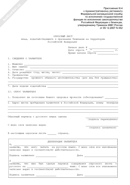 - 348Опросный лист лица, ходатайствующего о признании беженцем на территории Российской Федерации