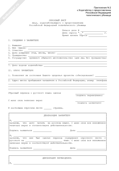 - 347Опросный лист лица, ходатайствующего о предоставлении Российской Федерацией политического убежища (приложение к ходатайству о предоставлении Российской Федерацией политического убежища)