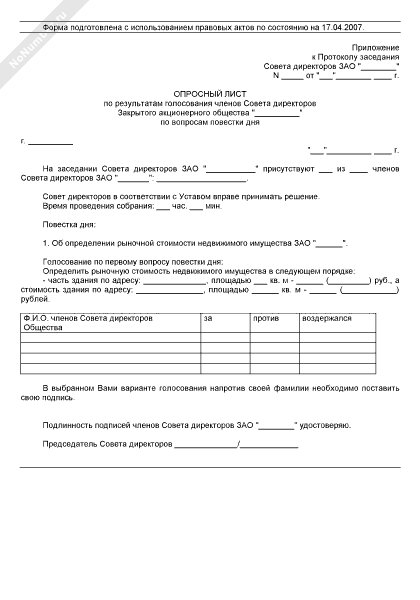- 350Опросный лист по результатам голосования членов совета директоров по вопросам повестки дня заседания совета директоров о решении вопроса об определении рыночной стоимости недвижимого имущества общества (приложение к протоколу заседания совета директоров закрытого акционерного общества)