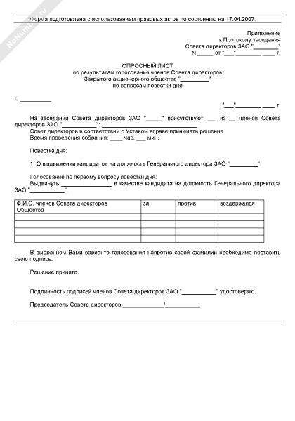 - 353Опросный лист по результатам голосования членов совета директоров закрытого акционерного общества по вопросам повестки дня заседания совета директоров, на котором решался вопрос о выдвижении кандидата на должность генерального директора общества (приложение к протоколу заседания совета директоров закрытого акционерного общества)