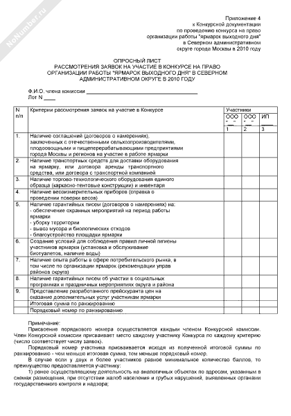 - 355Опросный лист рассмотрения заявок на участие в конкурсе на право организации работы «ярмарок выходного дня» в Северном административном округе города Москвы в 2010 году