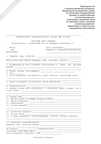 - 356Опросный лист ребенка, разлученного с родителями или не имеющего родителей в территориальном органе ФМС России