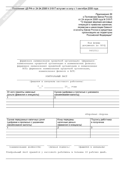 - 128Контрольный лист кассового работника, ведущего учет сумм наличных денег, принятых на обработку и сданных после обработки в кредитной организации (внутренних структурных подразделениях кредитной организации)