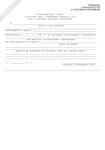 - 125Контрольный лист (бланк) о доставке лица, подлежащего приводу в суд или к судебному приставу-исполнителю