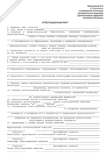 Аттестационный лист муниципального служащего администрации городского поселения Лотошино Московской области (рекомендуемый образец заполнения)