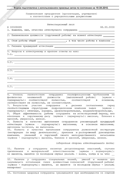 Аттестационный лист работника организации