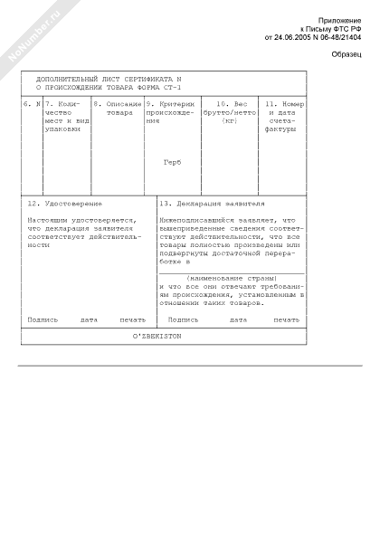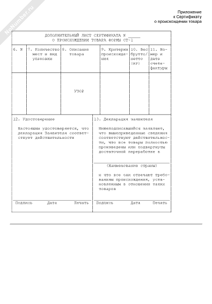 Дополнительный лист сертификата о происхождении товара. Форма № СТ-1
