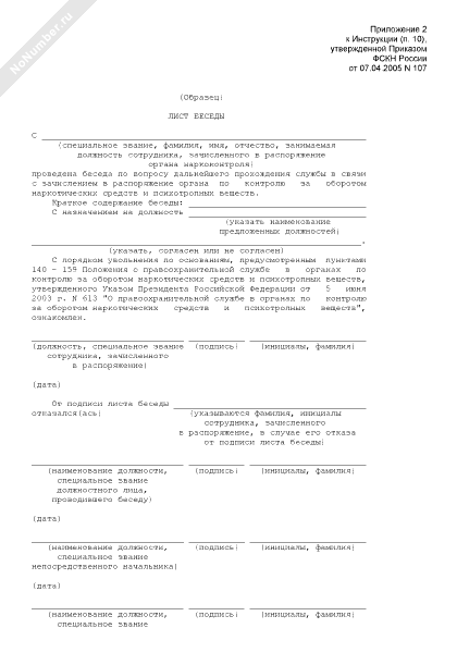 Лист беседы по вопросу дальнейшего прохождения службы в связи с зачислением в распоряжение органа по контролю за оборотом наркотических средств и психотропных веществ (рекомендуемый образец заполнения)
