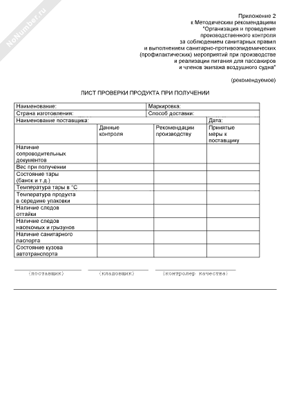 Лист проверки при получении продукта питания для пассажиров и членов экипажа воздушного судна (рекомендуемая форма)