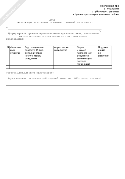 Лист регистрации участников публичных слушаний в Красногорском муниципальном районе Московской области (рекомендуемый образец заполнения)