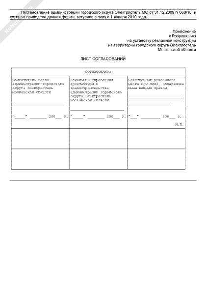 Лист согласований (приложение к разрешению на установку рекламной конструкции на территории городского округа Электросталь Московской области)