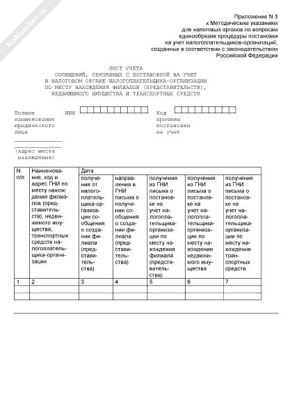 Лист учета сообщений, связанных с постановкой на учет в налоговом органе налогоплательщика-организации по месту нахождения филиалов (представительств), недвижимого имущества и транспортных средств
