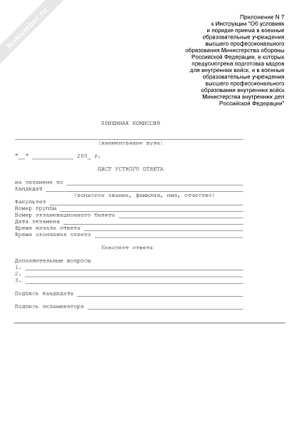 Лист устного ответа кандидата для зачисления курсантами в военно-учебное заведение (рекомендуемый образец заполнения)