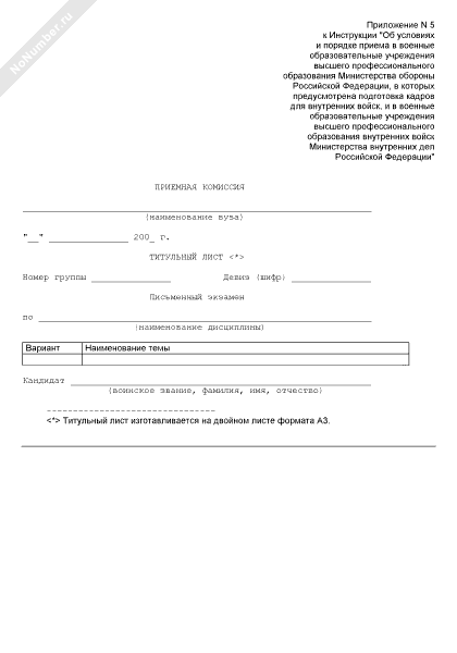Титульный лист письменного экзамена поступающего в военно-учебное заведение (рекомендуемый образец заполнения)