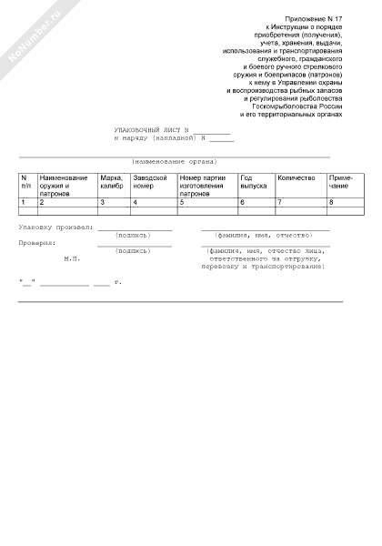 Упаковочный лист к наряду (накладной) для просчета оружия и боеприпасов (патронов) при передаче оружия другим территориальным органам главрыбвода