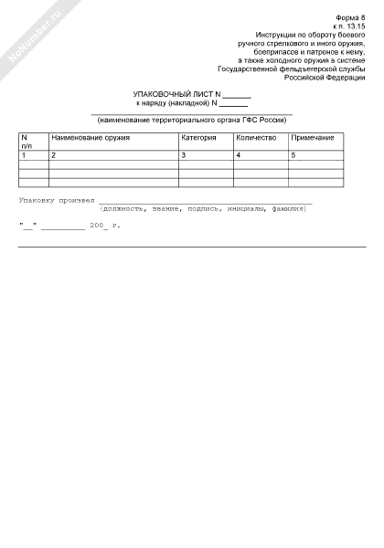 Упаковочный лист к наряду (накладной) на выдачу оружия (форма № 8)