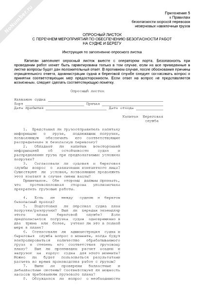 Опросный листок с перечнем мероприятий по обеспечению безопасности работ на судне и берегу (рекомендуемый образец заполнения)