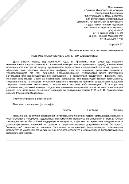 - 8Надпись на конверте с закрытым завещанием. Форма № 67