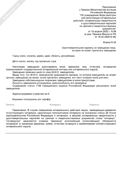 - 16Удостоверительная надпись на завещании лица, которое не может прочитать завещание (форма № 24)