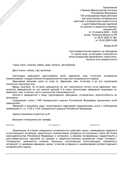 - 20Удостоверительная надпись на завещании от имени лица, не могущего подписаться лично вследствие физического недостатка, болезни или неграмотности (форма № 28)
