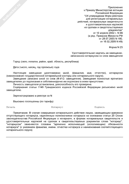 - 15Удостоверительная надпись на завещании, записанном нотариусом со слов завещателя (форма № 23)