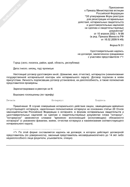 - 23Удостоверительная надпись на договоре, заключенном гражданами с участием представителя. Форма № 31