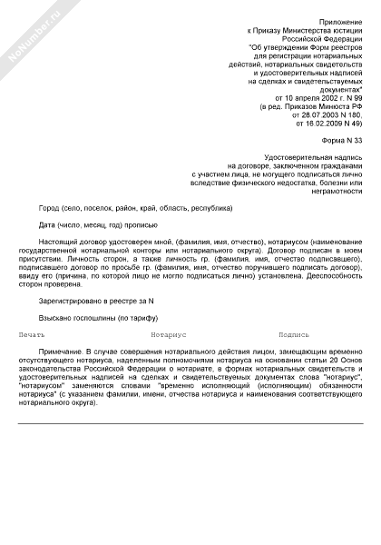 - 25Удостоверительная надпись на договоре, заключенном гражданами с участием лица, не могущего подписаться лично вследствие физического недостатка, болезни или неграмотности. Форма № 33