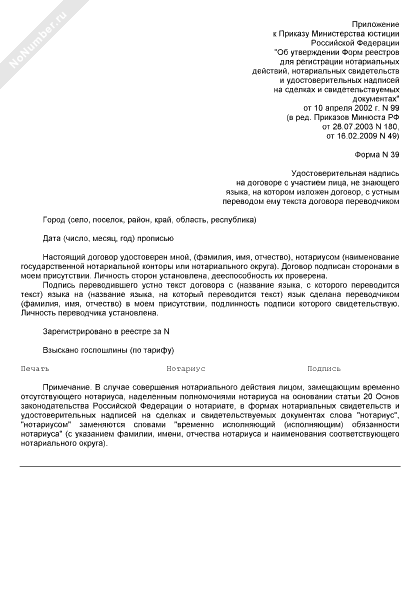 - 31Удостоверительная надпись на договоре с участием лица, не знающего языка, на котором изложен договор, с устным переводом ему текста договора переводчиком. Форма № 39