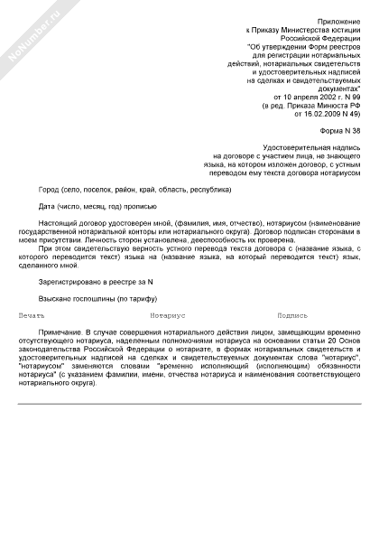 - 30Удостоверительная надпись на договоре с участием лица, не знающего языка, на котором изложен договор, с устным переводом ему текста договора нотариусом. Форма № 38