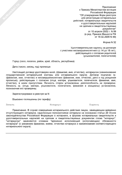 - 24Удостоверительная надпись на договоре с участием несовершеннолетнего (с 14 до 18 лет), действующего с согласия родителей (усыновителей, попечителей). Форма № 32