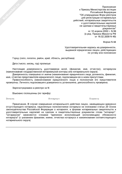 - 36Удостоверительная надпись на доверенности, выданной юридическим лицом, действующим по уставу или положению. Форма № 44