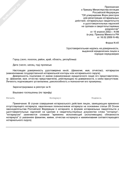 - 37Удостоверительная надпись на доверенности, выданной юридическим лицом в порядке передоверия. Форма № 45