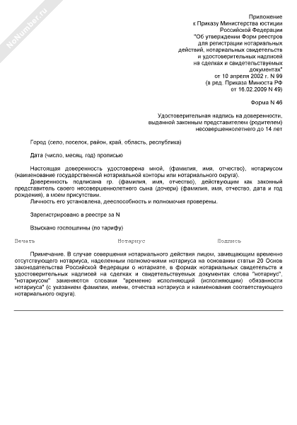 - 38Удостоверительная надпись на доверенности, выданной законным представителем (родителем) несовершеннолетнего до 14 лет. Форма № 46