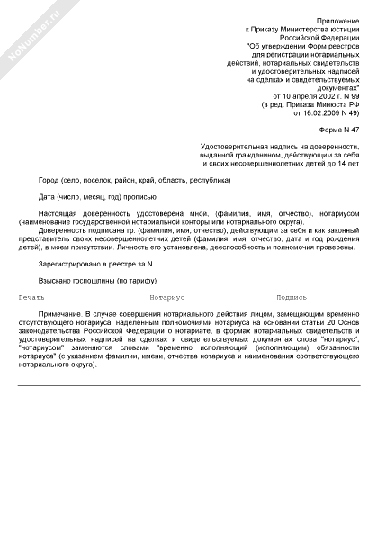 - 39Удостоверительная надпись на доверенности, выданной гражданином, действующим за себя и своих несовершеннолетних детей до 14 лет. Форма № 47