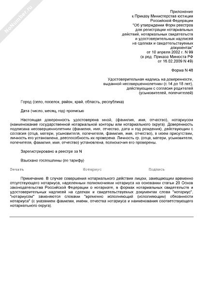 - 40Удостоверительная надпись на доверенности, выданной несовершеннолетним (с 14 до 18 лет), действующим с согласия родителей (усыновителей, попечителя). Форма № 48