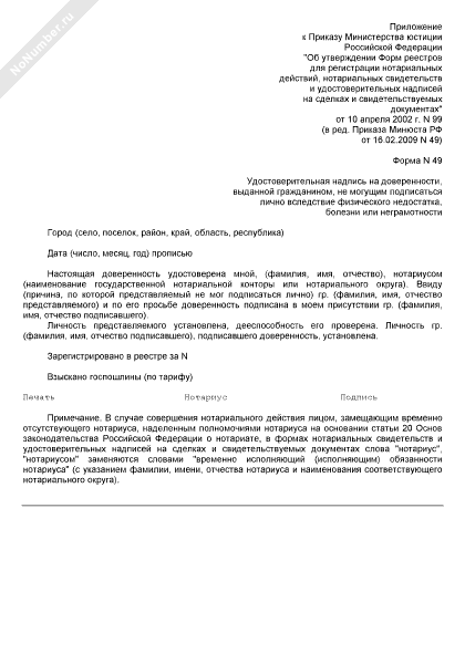 - 41Удостоверительная надпись на доверенности, выданной гражданином, не могущим подписаться лично вследствие физического недостатка, болезни или неграмотности. Форма № 49