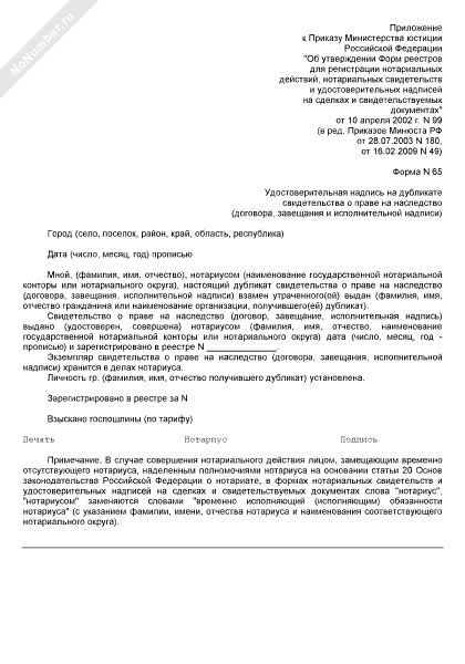 - 57Удостоверительная надпись на дубликате свидетельства о праве на наследство (договора, завещания, доверенности и исполнительной надписи). Форма № 65